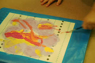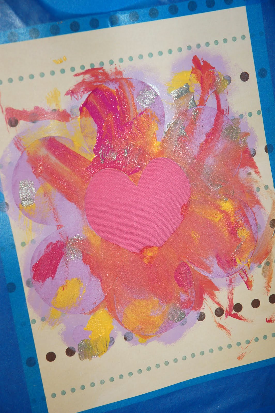 I took my turn painting first, using a foam brush to completely fill in the background of the image… this way, I didn't have to worry about Max's painting completely filling the shape and then losing the outline when the stencil came off. (And I wanted a chance to play too! LOL)