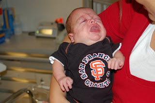 We slept well on Tuesday night… our last night like that for some time! We got into Walnut Creek and realized we'd forgotten the receiving blankets we needed to snug tiny Max into his car seat, so after an emergency trip to Target, we were at the hospital signing discharge papers! I'll spare you the boring details and get on with the photos. I'm still waiting to get a few from our papparazzi (my sister and Ann Marie, along with Faith and Ryan, were there to see us off!) but here are some to tide you over! ๐