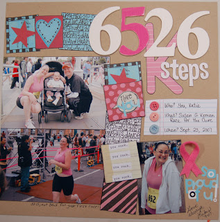 So the 6526 is an estimate… I asked some friends to estimate their stride length (friends closer to Katie than me in height) and I did the math. When I found there was a convenient “5” in the number, I decided to basically overlap two different titles, the 6526 steps and the 5k. There's loads of Love, Elsie on this, some Thickers and some KI bubble letters and felt and buttons.