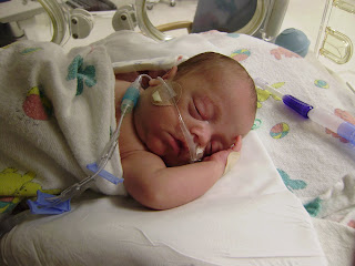 We went in to see Max last night and were amazed and thrilled to see (for me, for the first time) the bottom half of his face, all naked and free of medical junk! His feeding tube has been relocated to his nose (called an NG tube; you can just barely see it on the “underside” of his face in the pic) so now there's more of his gorgeous little face available for kisses!