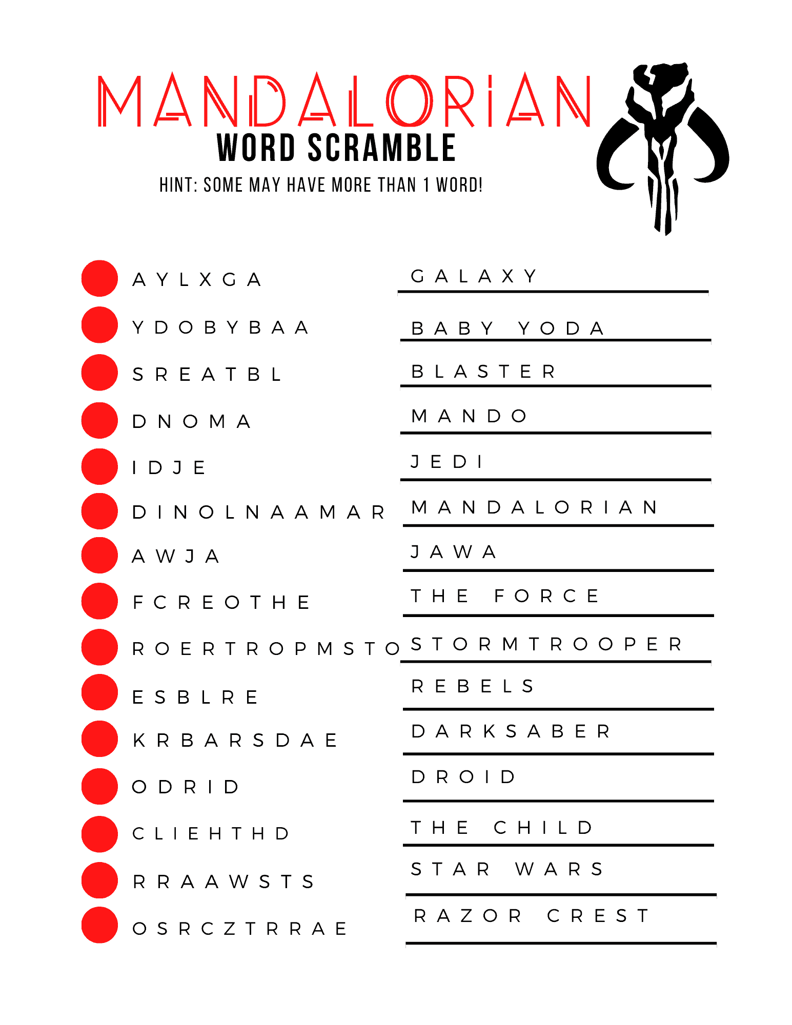 [ Find the solution to the word scramble here! ]Of course, we LOVE The Mandalorian around here, so we're super excited for season two and MORE BABY YODA! Be sure to check out the rest of our Star Wars and Baby Yoda content:
