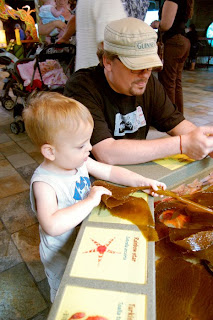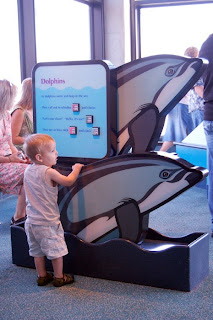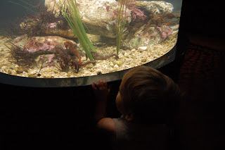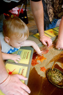 The kid has no fear. Touch a seastar? Sure! Slimy kelp? No problem! Hold a hermit crab? Cool! He loved the touch and feel exhibit, and I think that next time we go (next summer maybe?) he'll be big enough for the next step up in participation, which has even more interactivity and touchability!