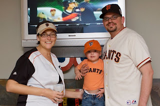 When Jamie got home, he found his jersey and hat on the front door, ready for him to put on, and Max and I were already all dressed and waiting! (He actually got off work an hour after first pitch, so the game wa being DVR'd while I avoided the internet so the results wouldn't be spoiled for me!)