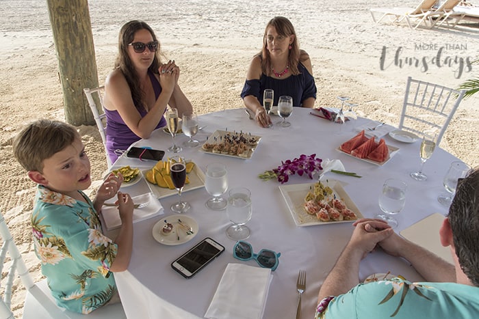 After our ceremony, we stepped over to a palapa on the beach, where our reception was set up and waiting for us. A table with our selected snacks, and a separate table held our sweet little cake and champagne and sparkling cider on ice.