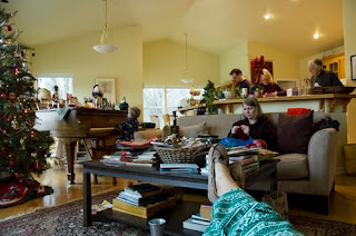 And a new one, from yesterday (obviously!) My favorite kind of chaos. A warm toasty room, with the cold morning outside the window. Max is banging away on the “pinano,” serenading us with Twinkle Twinkle. Amelia's knitting on the couch, Jamie, Lucinda and Ed are futzing in the kitchen, and I'm just sitting with my feet up, taking it all in. This is pretty close to a perfect day for me.