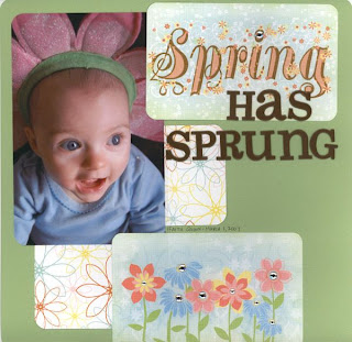 The story behind it: Katie took this series of pics of Faith in her Dollar Spot headband a couple of weeks ago… I printed this pic to scrap, because it cracked my ass up, and I headed off to a crop that night. I got my assignments for the month, and happened to be given these “Seasons” cards. How perfect could they be? The “Spring” card and the flowers at the bottom were from my assigned product. How cute is this kid?