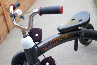 I didn't get a chance to take pictures of Max and his gift from Katie (and Family) so here it is! While the ride-on is *technically* a hand-me-down, it's been pimped out for Max, and is even came with accessories! A cool custom paint job (with flames!) and some fuzzy dice is all a guy needs to hit the road in style! (Well that, and a couple more inches so his feet reach the ground!) The t-shirt is cute too, but what isn't pictured is the chunk of flame and skull adorned fabric we got so that I can make him a ‘do rag to go with the whole ensemble! LOL A very sweet, very creative gift from Auntie Katie et al, and we can't wait until Max is big enough to actually *ride* it!