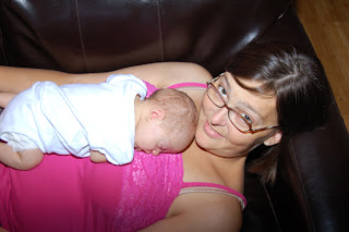 Since he came home, so much has happened! At his pediatrician's visit last week, he was up to 7lbs 7.6 oz… that was just a hair shy of an ounce a day! If he's been continuing on that pattern, he's over 8 lbs now! When I take him out places, I wear him in our Moby Wrap, which he loves. He's cozy and comfy and I love it because it leaves my hands free for whatever I'm doing (like EATING!)